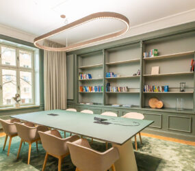 Vi valde att använda olika armaturer i olika rum, från ringformade och stora ovala LED-armaturer till linjära och väl avbländade armaturer till en serie med stor skärm som ger ett mycket bra ljus för arbetsytor men ändå har en mycket trivsam framtoning.