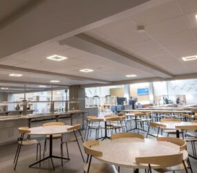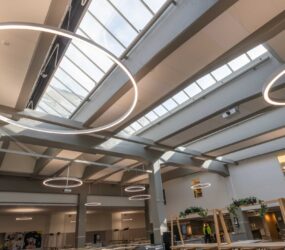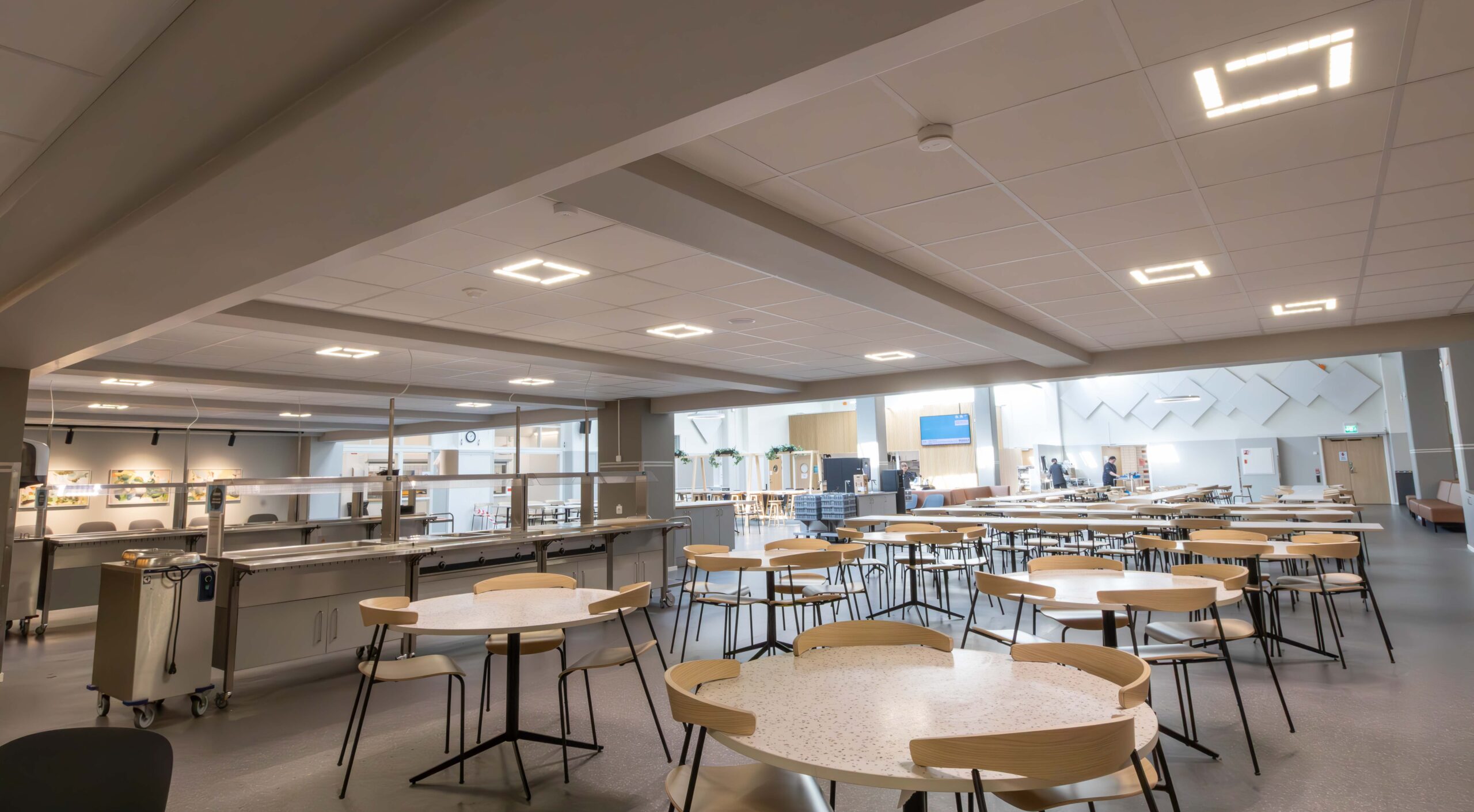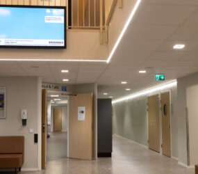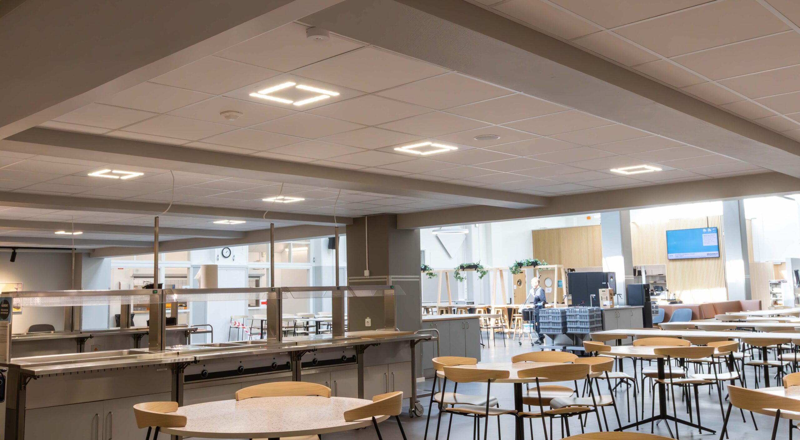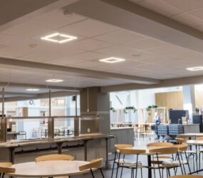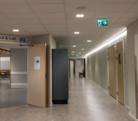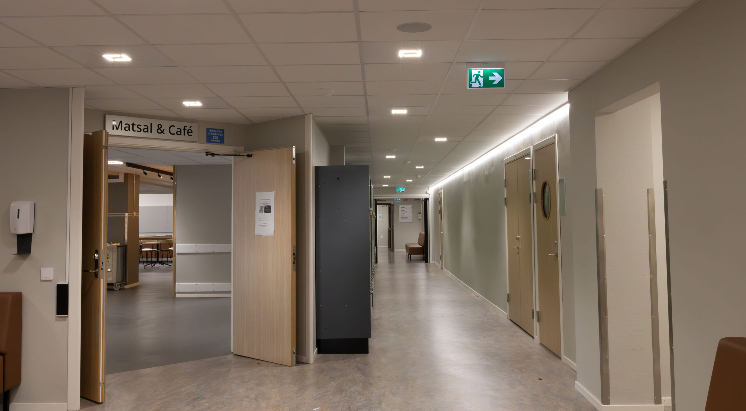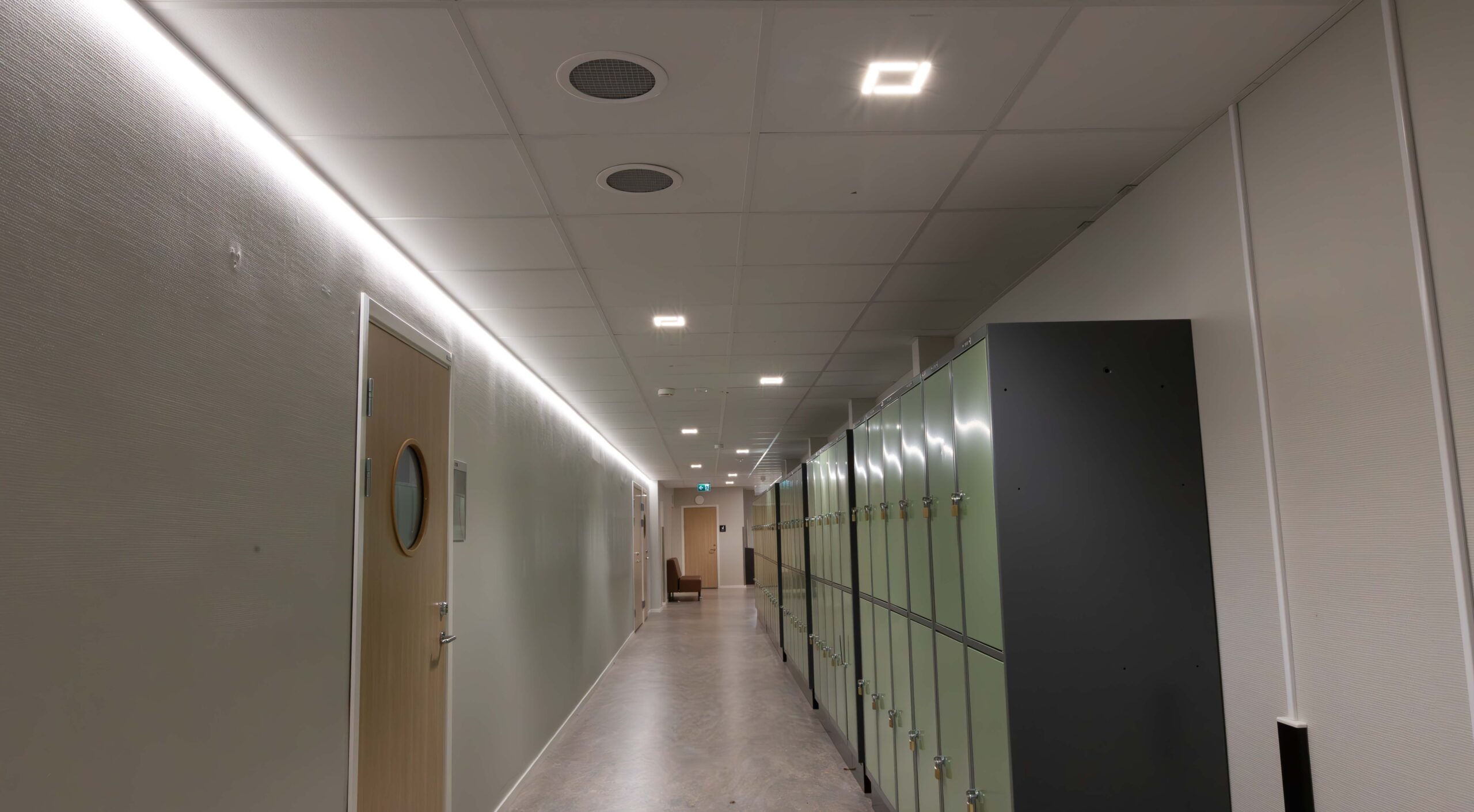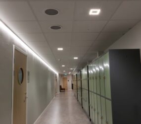 I matsal och andra allmänytor installerades två olika varianter av armaturer från vår partner Luxintec, Modux (P5 och P2), som kan monteras infälld i undertak eller gipstak, pendlas eller ytmonteras. Modux är ett betydligt trevligare och ett synergonomiskt bättre alternativ till traditionella LED-paneler. Modux-serien har också många optioner vad gäller ljuskvalitet och har dessutom många optiska möjligheter. I kombination med LED-lister i passager och korridorer får man en flerdimensionell belysningslösning som gör mörka utrymmen betydligt trivsammare.