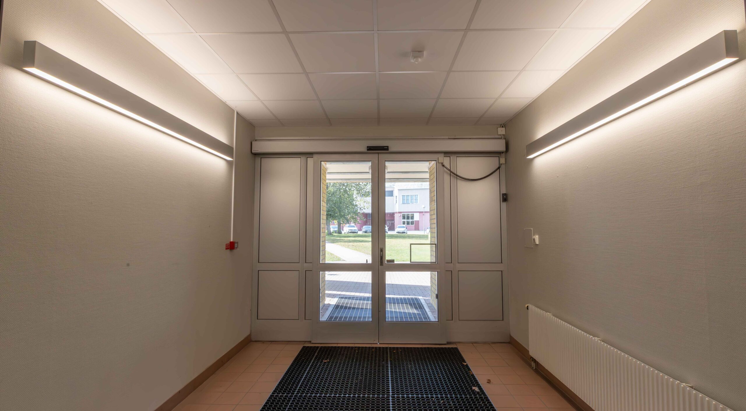 Eleverna välkomnas i den annars mörka entrén av en över tre meter lång Matric Wall-armatur med behagligt upp- och nerljus.