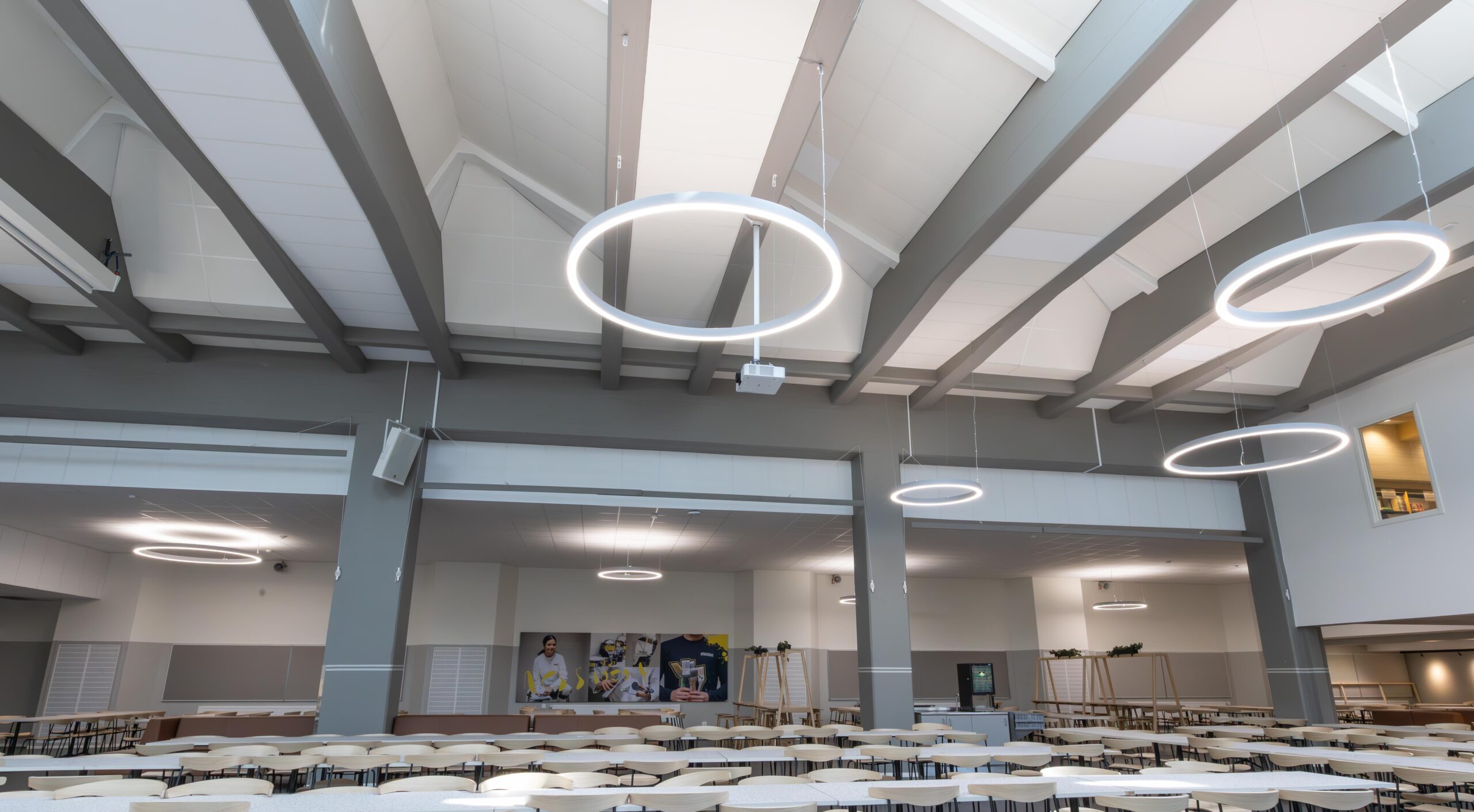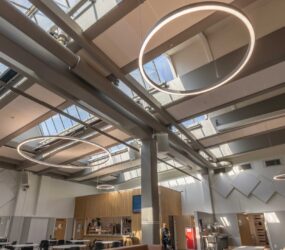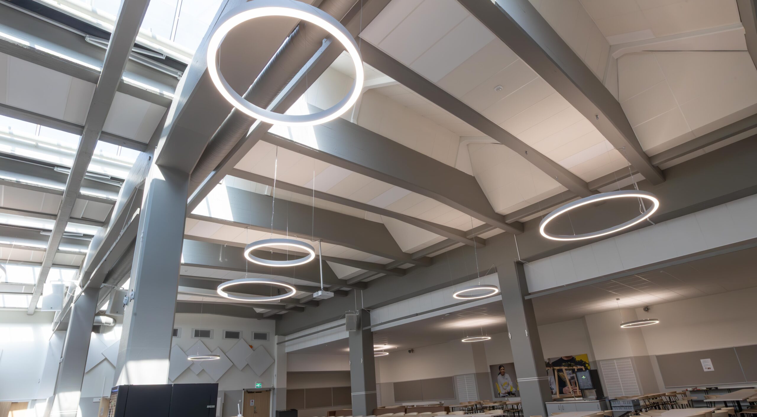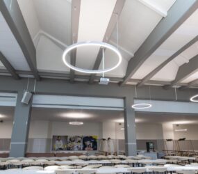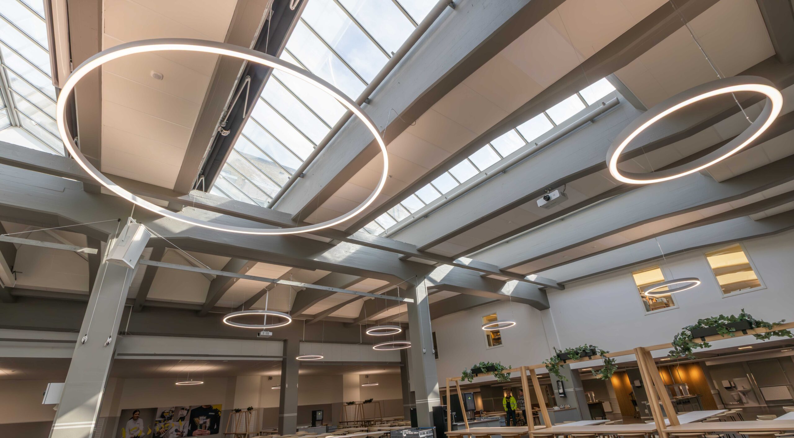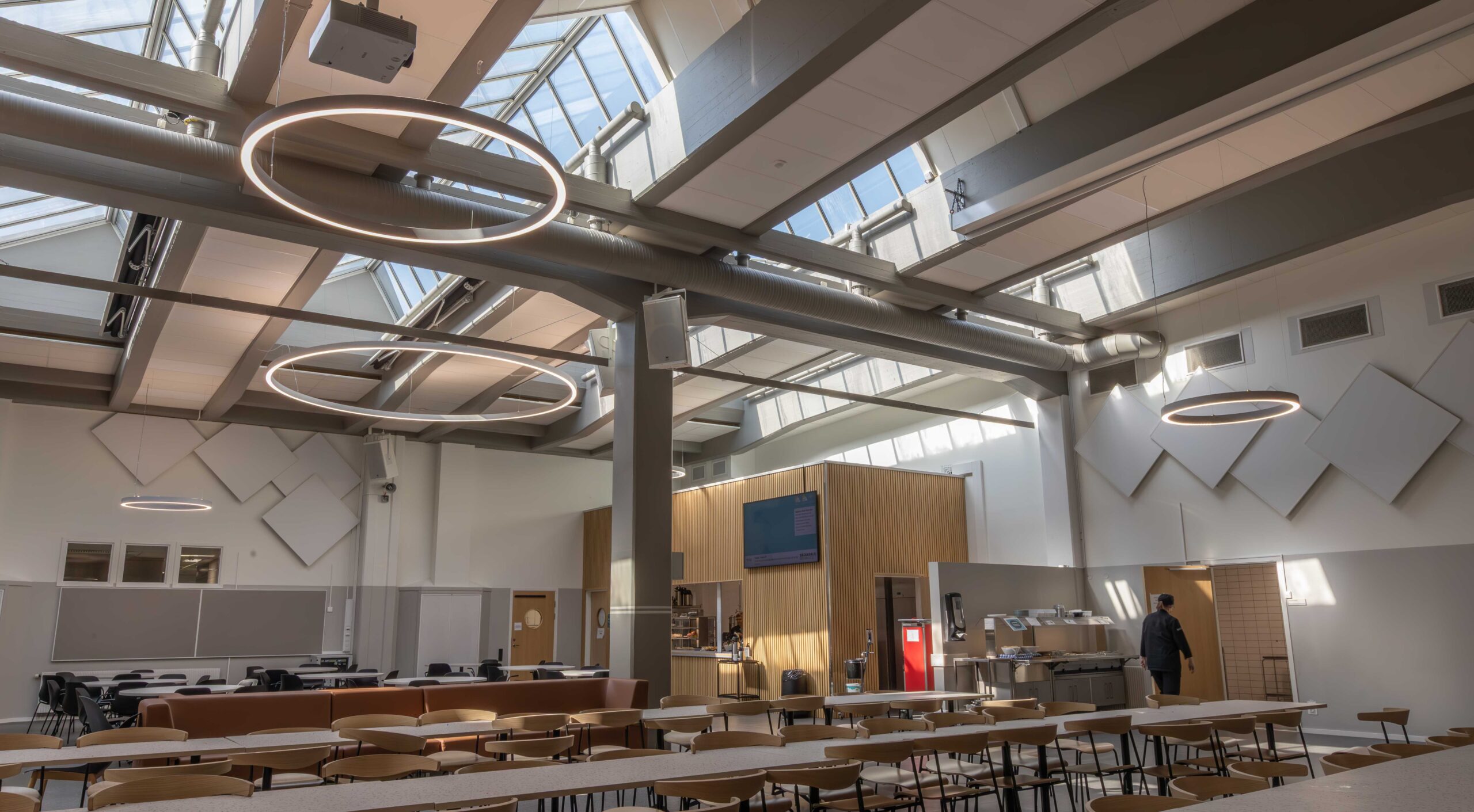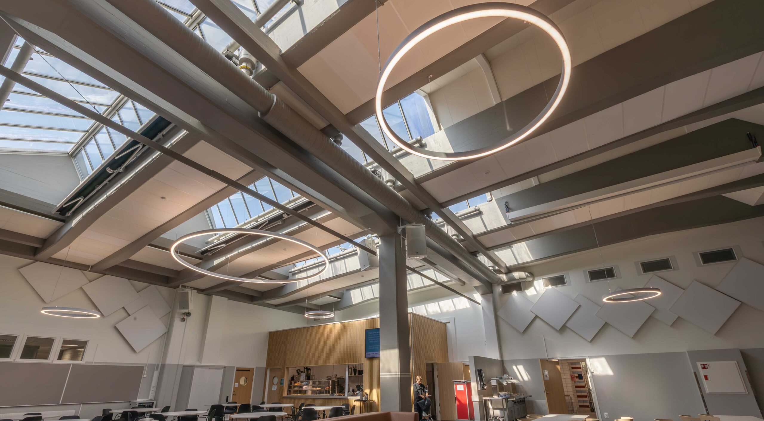 Från vår partner Lightnet valdes armaturmodellen Ringo Star. Ett antal olika storlekar monterades på olika höjder i skolmatsalen och i skolans atrium. Det finns många olika tillval och storlekar av Ringo Star, här valdes en pendlad modell i Radiant Silver. Bland annat så monterades varianter i diameter 1200, 2000 och 4000 mm med direkt- och indirekt ljusfördelning. Ringo Star går att beställa i färgtemperaturer mellan 2200 Kelvin till 6500 Kelvin och man kan välja spektrumkvalitet Ra>80, Ra>90 eller fullspektrum. Dessutom finns det olika alternativ för ljusstyrning: ON/OFF, Casambi, Pushdim eller DALI. I detta projekt valdes armaturer med 4000 Kelvin med DALI-styrning.